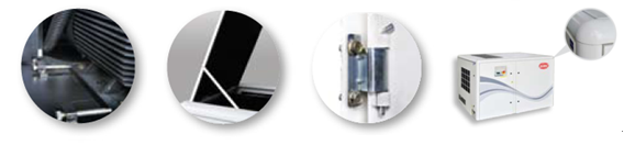 — -一體式冷卻模塊,專利設計的冷卻風扇配合特別設計的導風罩,有效降低了機組噪音,同時提高了機組的運行效率 — 機組采用離心式風扇 |